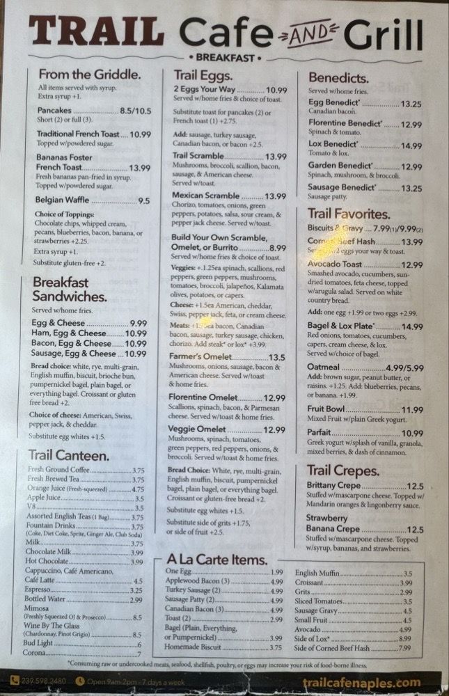 Trail Cafe & Grill is a popular diner in Naples, FL, known for its breakfast and brunch offerings. With a revamped interior and a buzzing atmosphere, it's a great spot to start your day. The menu offers a variety of options, including seafood pasta and scallops for dinner, along with traditional breakfast items like eggs, omelettes, and pancakes. The restaurant also has a decent wine list and excellent service. Overall, Trail Cafe & Grill offers great value and quality food, making it a must-visit for those looking for a satisfying meal. Whether you're stopping by for brunch or dinner, you're sure to enjoy the delicious dishes and friendly atmosphere at Trail Cafe & Grill.
